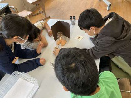 ものが燃えるときの空気の動きや入れ替わり方を実験で確かめました。安全に気を付けて、協力して実験しています!