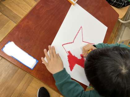 などを いっぱいはなしながら いろんなかたち いろ かおの おひさまを かきました。
