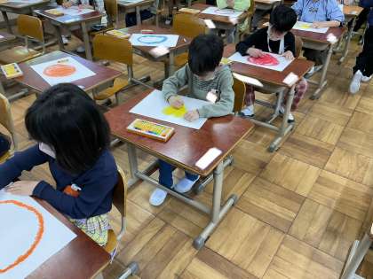 ずがこうさくのがくしゅうで 「おひさま にこにこ」を かきました。