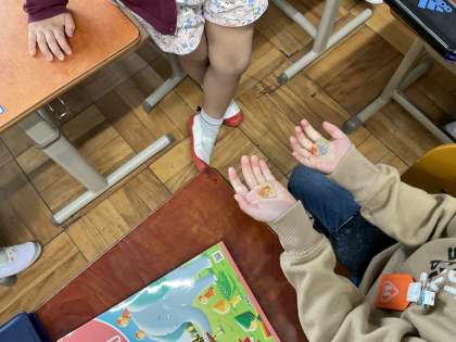 さいしょは すうずブロックをつかって かんがえて そのあとに おはじきをつかって 「いくつといくつゲーム」をしました。