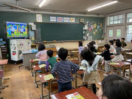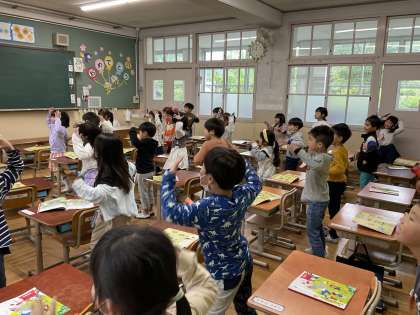 おんがくの がくしゅうで ちぇっちぇこりを うたって おどりました。