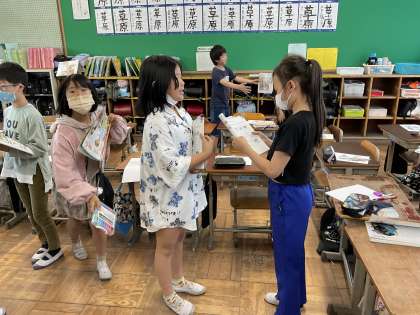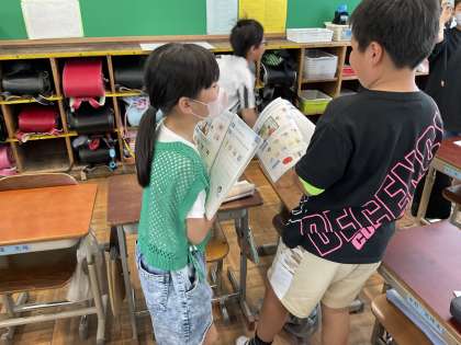 外国語学習で、友だちにWhat color do you like?という表現を使って、友だちとやりとりをしました。みんな楽しんで学習ができました。