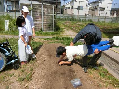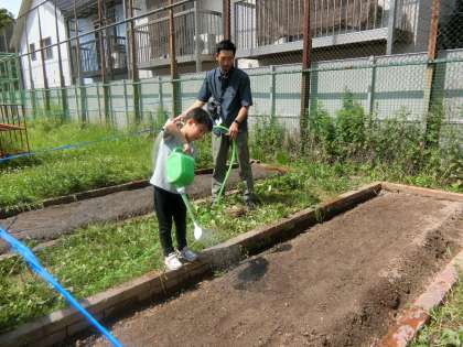 ひまわり学級の学校園では、オクラや二十日大根、ポップコーン、にんじん、ルッコラを育てています。みんなで協力して種をまくことができました。天気の良い日は、みんなで手分けをして水やりをしています。心を込めて育てたおかげで、ついに先日芽が出始めました!!