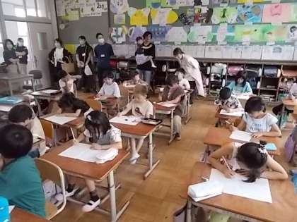 友達の作品を見ながら、「〇〇さんの花火がいろいろな色を使っていてとてもきれいでした。」や「●●さんが書いた海の様子がまるで本物みたいですごかったです。」など友達の良さをいっぱい見つけていました。
