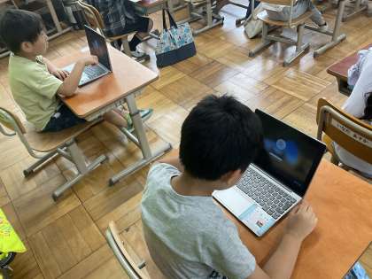 これから がっこうでつかう タブレットをつかって みんなで パスワードなどを にゅりょくして ログインしました。
