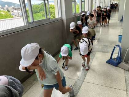 事前学習では、煙の特徴やこわさについて学び、火災時の避難で気を付けることを考えました。できるだけ体勢を低くしながら、ハンカチでしっかり口と鼻を覆って避難することができました。