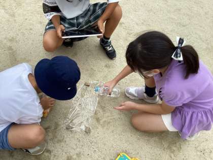 理科の授業で、地面のかたむきと水の流れる方向について観察をしました。みんな自分の予想と結果が同じなのかを楽しく観察していました。