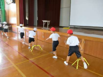 片足や両足で連続して跳んだり、助走をつけて片足で踏み切って跳んだりするなど、いろいろな跳び方で活動することができました。