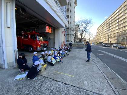 今日は、山科消防署に見学に行きました。消防士さんから、消防車の説明を聞き、驚きとワクワクの表情の子どもたち。質問に答えていただいている途中に、実際に出動があり、火事が起きた時の消防士の動きを目の当たりにしました。笑顔で質問に答えてくださっていた時の表情とは変わり、真剣な表情で素早く動いている消防士に、ドキドキした様子でした。とっても、学びの多い時間になりました。