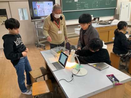電気にはどのような働きがあるのかを調べました。手回し発電機や光電池などを使って、豆電球に電気をつけたり、電子メロディを流したりしました。音が出たり出なかったりするのは、なぜかと興味を持っていました。