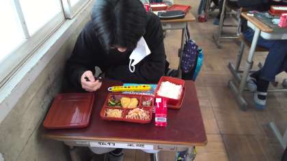 中学生に必要な栄養や,中学校給食についてを動画で学習してから試食を始めました。