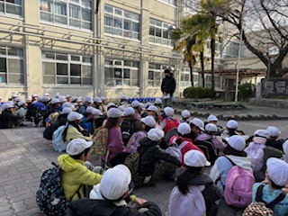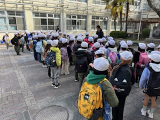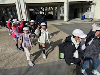 朝、西崎先生の話と校長先生の話を聞いてから、元気に出発しました。