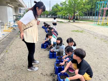 1年生は生活の『さいてほしいな わたしのはな』の学習であさがおの種をまきました。