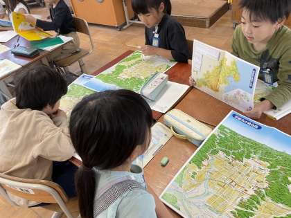 社会科の「京都市の様子」の学習で 京都市の地図を使って 調べ学習をしました。