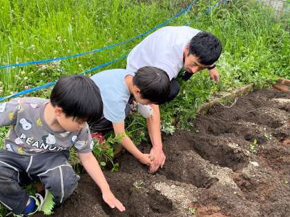 みんなで土を耕し、里芋と山芋の種イモを植えました。