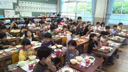 一年に一度、給食に納豆が登場する日です。教室に様子を見に行くと、「納豆おいしい〜!」「手巻き寿司みたいにしたよ〜!」と、喜んで食べていました。納豆が苦手な子も、お肉やのりの風味でおいしく食べられたかもしれませんね。
