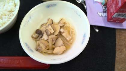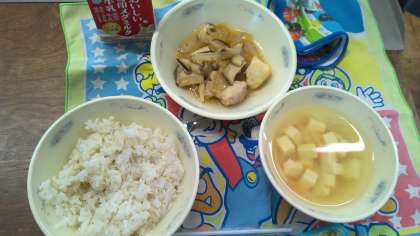 今日の給食の献立は、麦ごはん、牛乳、鶏肉のきのこごま甘酢あんかけ、豆腐のスープ