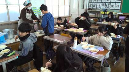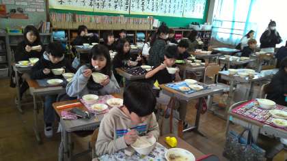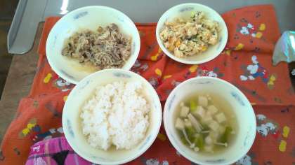 今日の給食の献立は、ご飯、豚肉とこんにゃくのいため煮、おから、花菜のすまし汁 でした。青ねぎや花菜など旬の食材を使用した「なごみ献立」です。