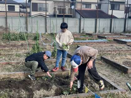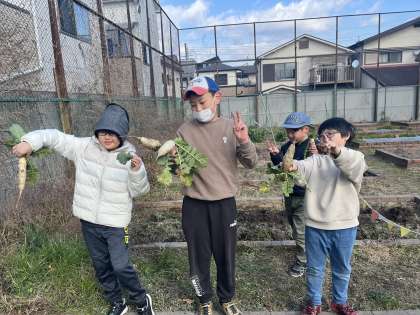 最近の寒空で土の中が凍っていたこともあり、1年生が一人で抜けない大根は4年生、5年生のお兄さんたちが途中まで引っ張ってあげたり、抜き方を教えてあげたりしてみんなで協力しながら収穫することができました。