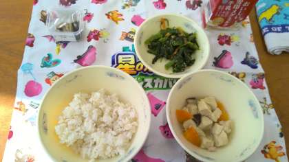 今日の給食の献立は、麦ごはん、牛乳、高野豆腐と野菜のたき合わせ、ほうれん草のごま煮、すぐき,でした。