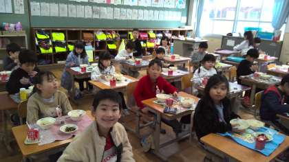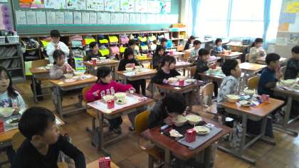 「塩だけでつけているから塩辛いんだよ。ご飯と一緒に食べるといいよ。」と先生が話していました。いろいろな食材に触れられるのは楽しいですね。食器を返しに来た3年2組のお当番の子たちは「おいしかったです。最高でした!」と大きな声で給食調理員さんにお礼を言っていました。とても微笑ましい光景でした。