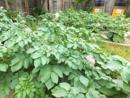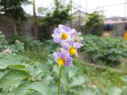6年生の学習園には,ジャガイモがいっぱい育っています。ムラサキ色のかわいらしい花が見頃です。