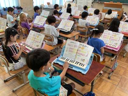「ド・レ・ミ・ファ・ソ」の運指を確認し、一人ずつ演奏したり、グループで演奏したりしています。授業を重ねるにつれて、どんどん上達しています。