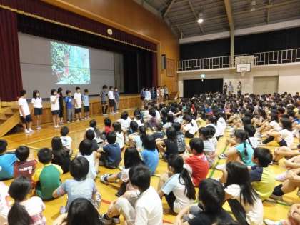みどりのカーテンプロジェクトでは,西洋アサガオを3階まで伸ばして日陰効果を期待しています。さらに,みんなが関心を高めていくように,スイカやメロンも並行して育て,「みどりのトンネル」になるように頑張っています。