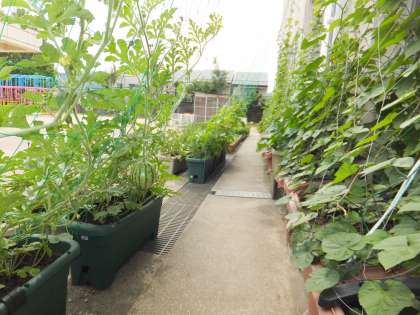 校内にも実がなる植物がいくつかあります。正門近くにはビワがたわわになり食べごろです。みどりのカーテンには,スイカもぶら下がっています。
