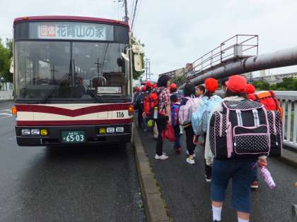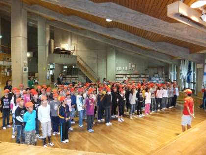あいにくの小雨の中,体育館で元気に出発式をしました。パスで2時間ほどかかって,花背山の家に到着。入所式では,元気いっぱい校歌を歌い,所員さんにほめていただきました。