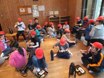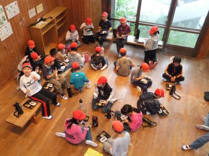 台風4号の接近で,外での活動が厳しくなりました。まずは,昼食のデラックスハンバーグ弁当で,今日から5日間お世話になる1棟の中でいただきました。