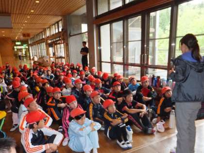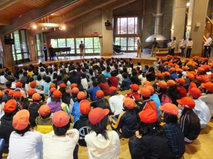 参加している4校が集まって,朝のつどいをしました。山は霧に包まれていますが,雨はあがって外での活動ができそうです。