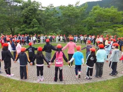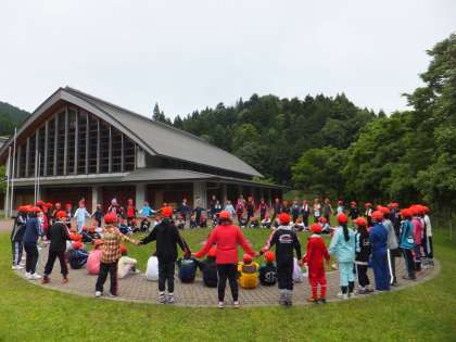 夕方には何と晴れ間が見えてきました。台風はどこへ行ったのでしょうか。4日目にするキャンプファイヤーの練習をしました。みんなとっても仲がいいです。マイムマイム……!