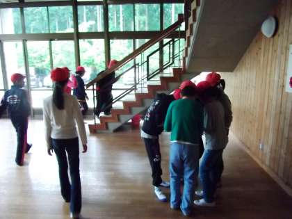 午前中は冒険の森アスレチックの予定でしたが,激しく降る雨のため,館内ポイントラリーに変更となりました。地図を見ながら,班で広々とした館内を探検して回りました。