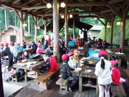 1日目に作った竹のおはしで,手作り焼きそばをおいしくいただきました。鉄板に焦げ付いた麺が香ばしくておいしいと好評でした。