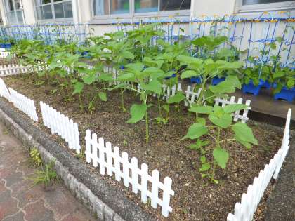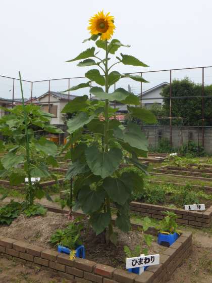 夏の定番「ヒマワリ」が,学習園で元気いっぱい(2m以上)に咲きました。昨年度種が落ちて咲いたものです。中庭にも,夏休みに咲き誇る準備中のヒマワリが順調に育っています。