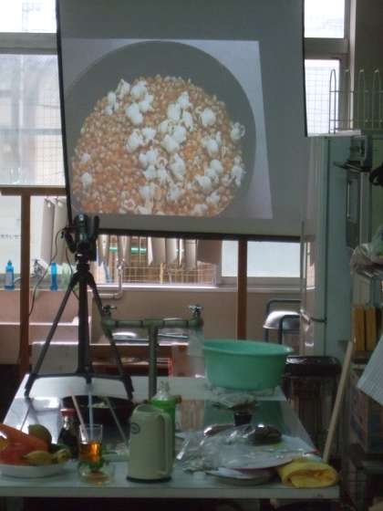 自由研究定番の「ボールのはずみ方」では,スーパーボールは自由落下でどのくらい跳ね返るか4択で予想していただき実験しました。「1/3くらい」「2/3くらい」「スタート位置くらい」「スタート位置より少し上くらい」とした場合,4番目が意外と多かったです。今回の実験で一番関心を引いたのは,トウモロコシの種を入れたフライパンを蓋をしないで机の上でゆすると,少しずつポップコーンになっていくものでした。初めて見たら誰もが驚くでしょうね。でも「すべて理科です。なぜか考えてみましょう。」というのが西田先生の最後の言葉でした。