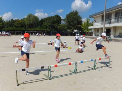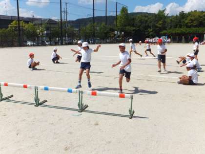 4年生のアイディア走は「とんでとんでGO!」で,初めての練習の様子です。歩幅を合わすのが難しく,スマートにまたぎ越したいです。