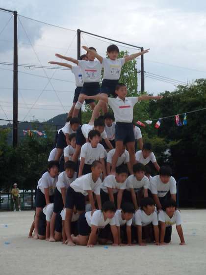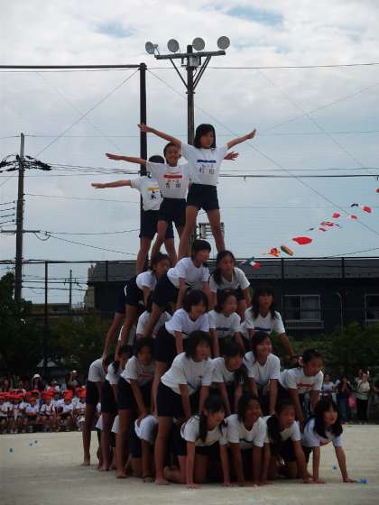 6年組体操。練習の成果の集大成。秋空に見事に輝きました。