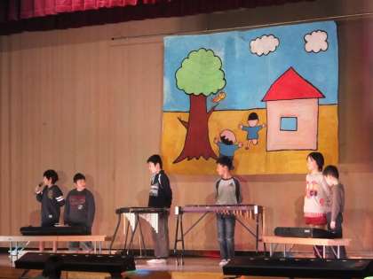 夏休み前から練習しました。キーボードにコード伴奏を入れて,木琴や鉄琴も加えて豊かな音になるようにしました。