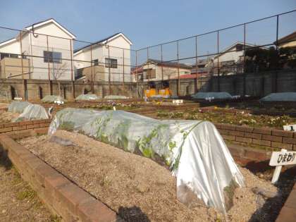 学習園やプランターには,春に向けて野菜が育てられています。今年は,トンネルといって,寒い冬にも負けないで野菜が育つようにビニールのおうちをいくつか作りました。