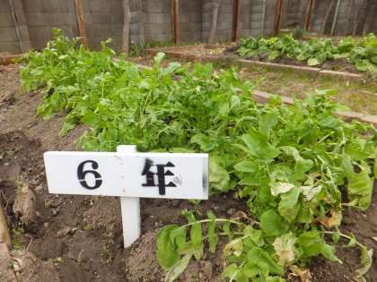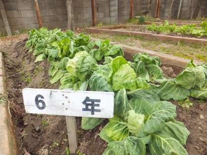 トンネルを外したら,すくすく育っているキャベツやダイコンが現れました。トンネルの中は,とっても温かかったようです。プランターではソラマメや青菜を育てています。