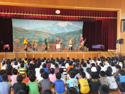 本場ボリビアからやってきたグループ「アカパラ」のアンデス音楽を楽しみました。音楽を通して,地球の裏側と仲良しになろうという内容です。