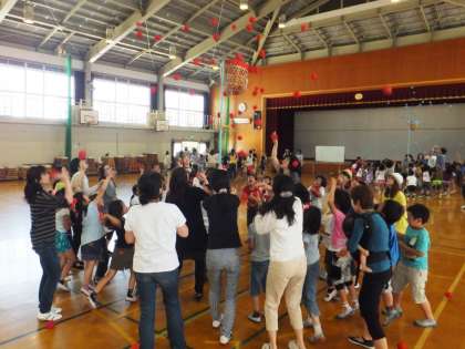 クラス対抗の玉入れ大会をしました。暑い体育館の中で,子どもも大人も必死になって,熱い戦いが繰り広げられました。