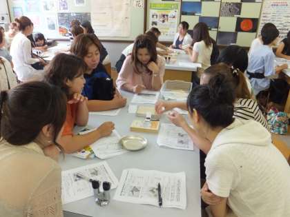 自由研究の定番である「紙の橋の強さ調べ」を子ども目線で体験していただきました。葉書大の紙で橋を作っても10円玉1枚さえ乗せることはできません。2ヶ所折り曲げて,強い橋を作ろうということで,コの字型に折り曲げて10枚近く乗せているチームがありました。こどもたちがワクワクするような自由研究ができるといいですね。70数名の参加があり,熱気むんむんの中,関心の高さを感じる内容でした。