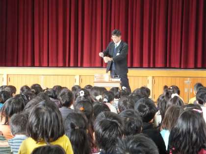 「空き缶つぶしを科学する」というテーマで,校長先生のミニ実験がありました。温めた空き缶が,水につけると一瞬でへこんでしまいました。近くで見ていた1年生は,何事かと驚いてのけぞっていました。