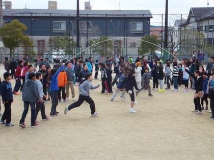 低学年はなみとびです。高学年はさすがで,8の字の高速とびでした。またクラスの絆が深まったことでしょうね。