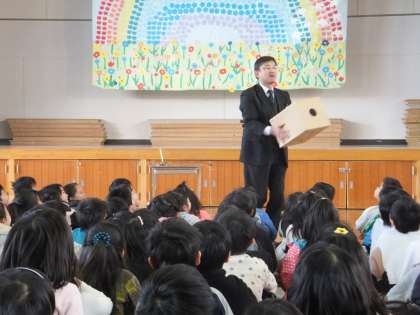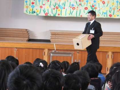 箱から飛び出す空気の動きを見るために,ろうそくの火を一撃で消しました。また,箱に煙を入れて,飛び出す速さや届く距離を確かめました。