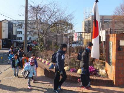 半旗を掲げた登校時の様子です。何人かの子どもたちは気付いたようで,3年前の悲しい出来事について,朝の会で担任の先生から説明を受けました。