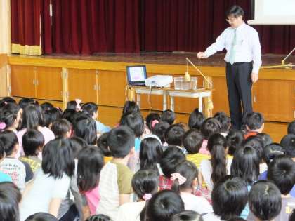 実験結果はご覧の通りでみんなはビックリ。沈むどころか浮いていました。割りばしの両側に糸で五円玉をつるして,水の入ったコップでぜひ試してください。